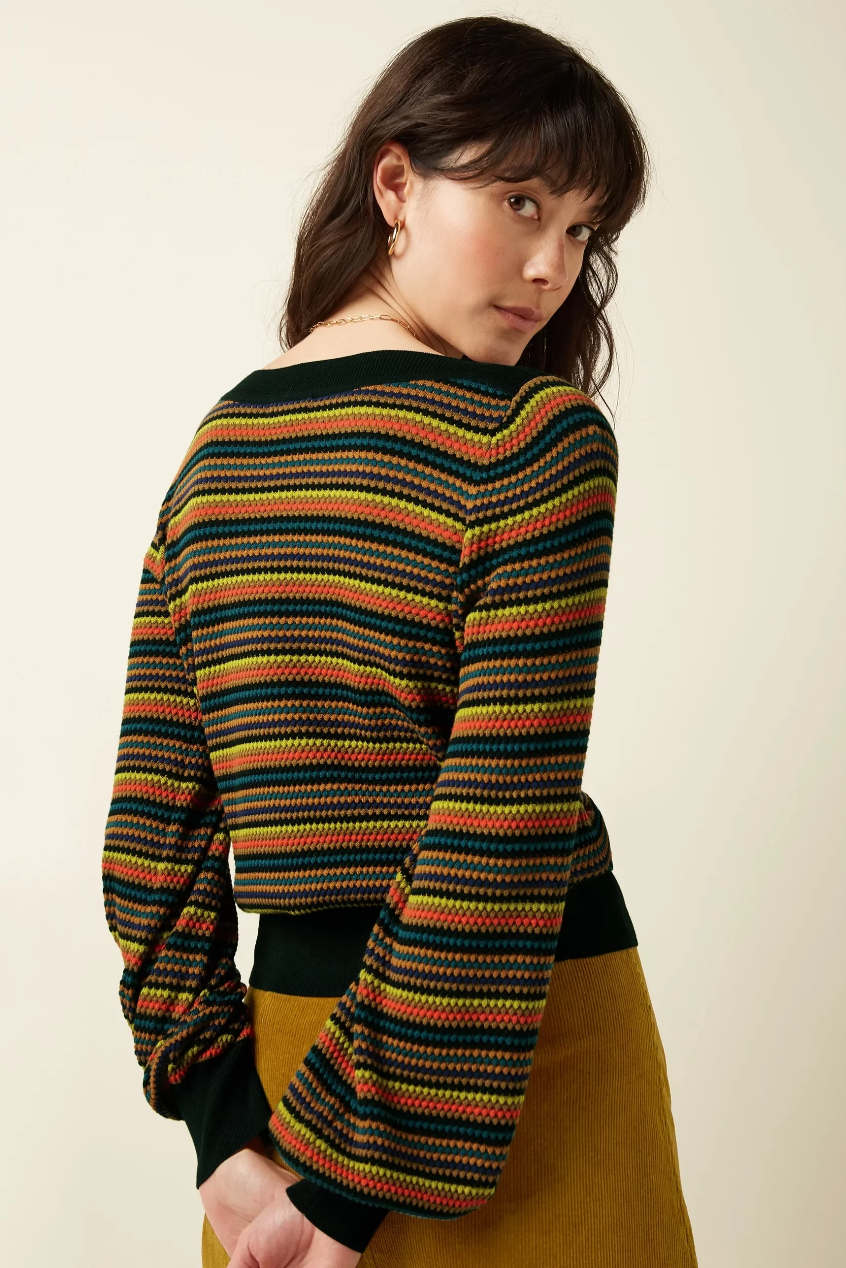 De Audrey Bell Top Marielle combineert elegantie en comfort met zijn lange klokmouwen afgewerkt met verfijnde manchetten. Gemaakt van zacht katoenen gebreide stof, heeft het een subtiele grafische print en een sierlijke boothals, waardoor een verfijnd silhouet ontstaat dat perfect is voor elke gelegenheid.