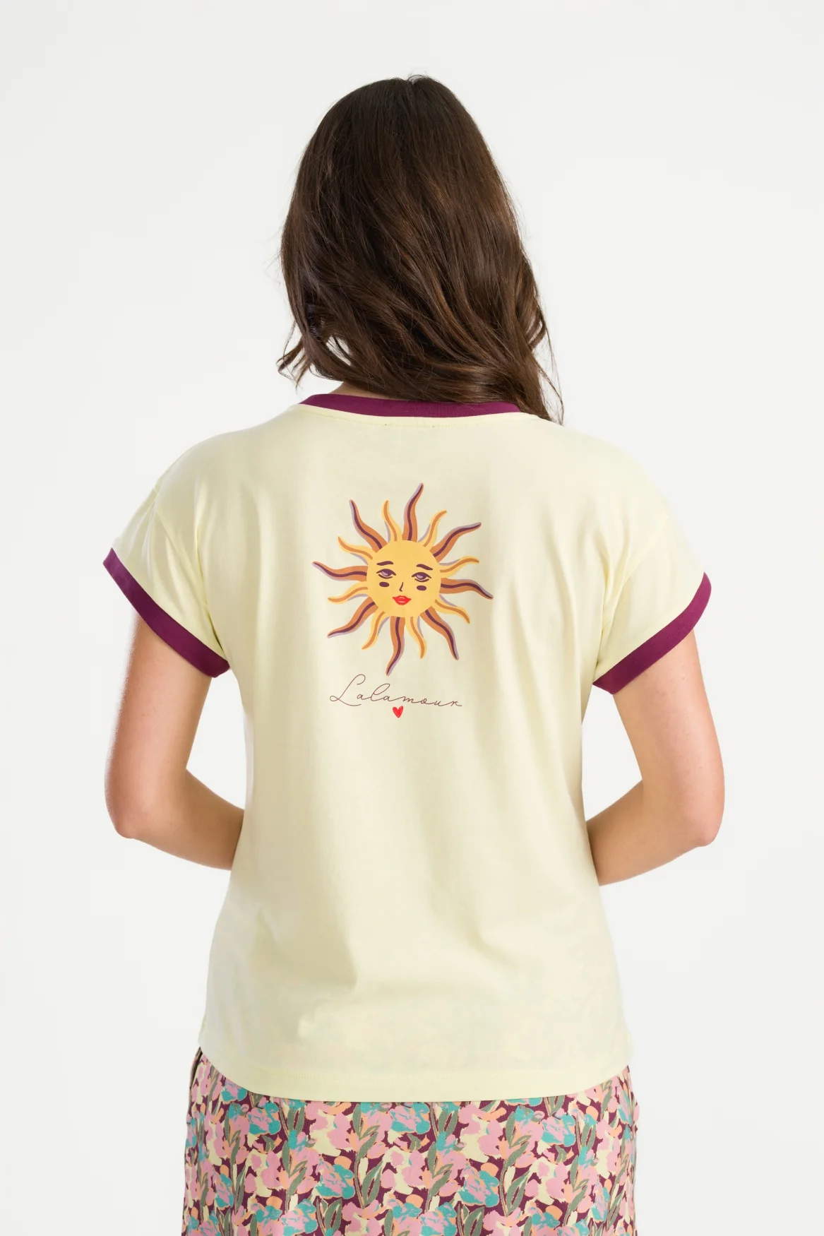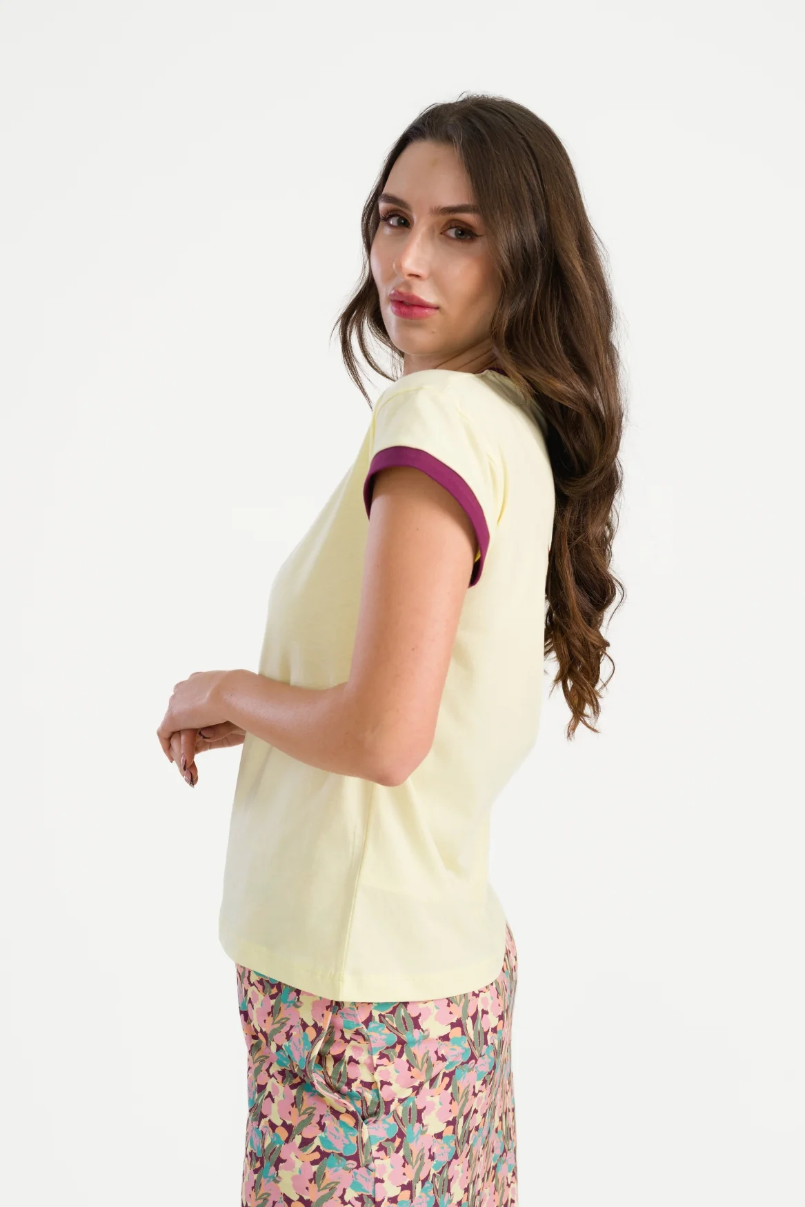 De April Top is gemaakt van elastische biologische katoenen jersey en heeft een ronde halslijn met contrasterende biesjes bij de hals en mouwen, wat zorgt voor een frisse, speelse look.