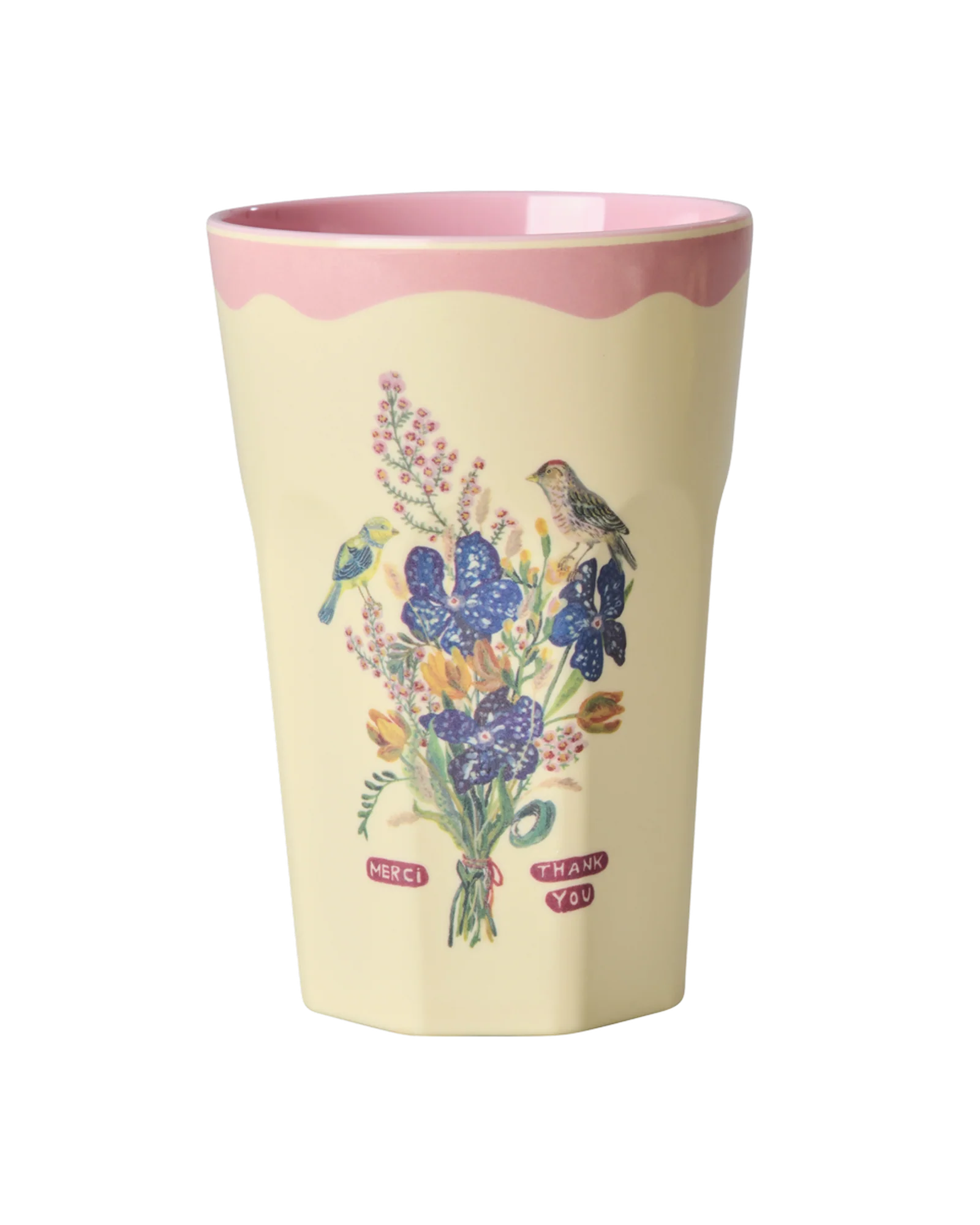 We vinden de bloemenprints die zijn ontworpen door Nathalie Lété helemaal geweldig. De ene print heeft bloemen in alle kleuren van de regenboog en de andere heeft leuke vogeltjes – allemaal op een set van 2 hoge melamine bekers – ZO leuk!