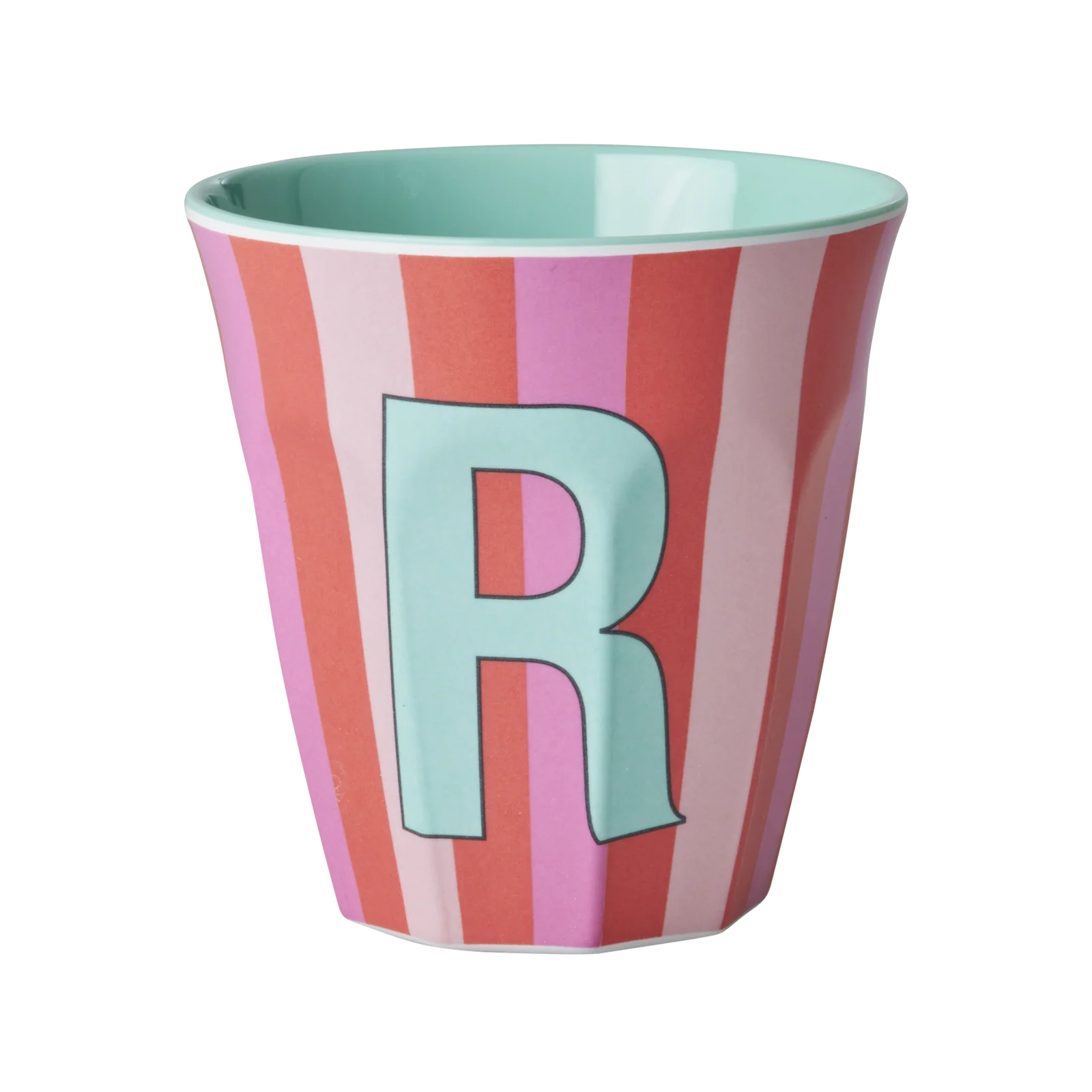 Rice: Medium melamine beker – Alfabet – R Roze Streep MELCU-ALPSTRRI