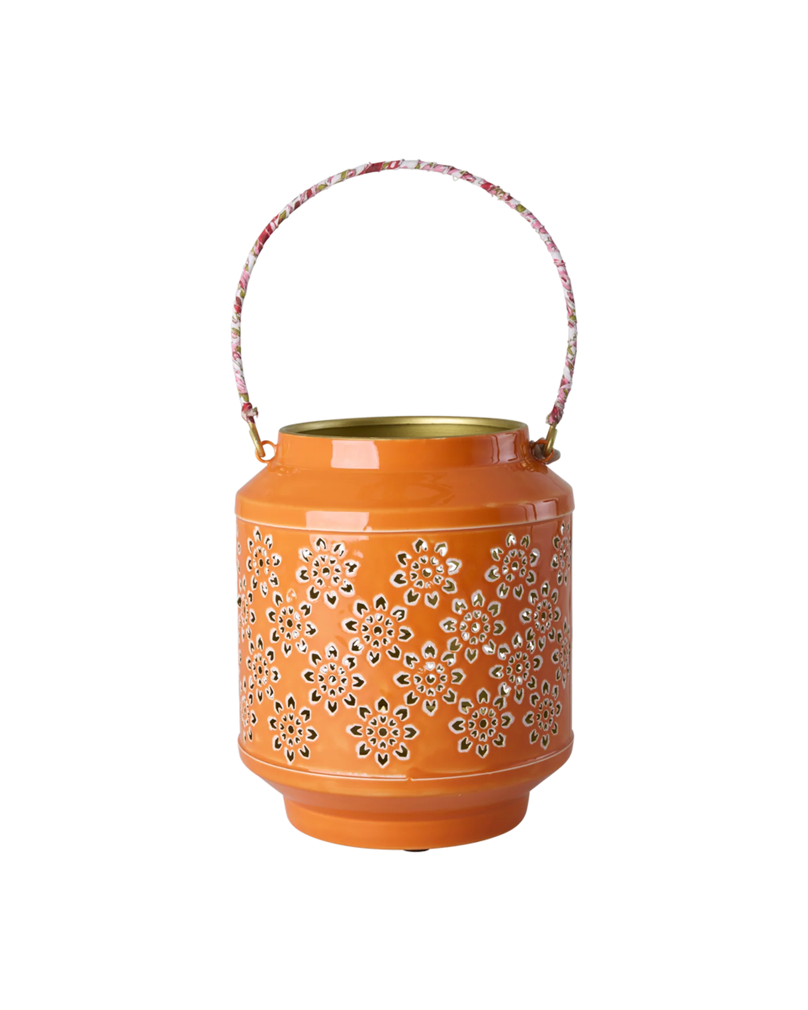Verlicht je huis met deze leuke lantaarn van metaal! De lantaarn heeft een mooi bloemenmotief en een goudkleurige binnenkant die voor een warme, magische gloed zorgt als je een kaarsje in de lantaarn aansteekt. De oranje kleur en het met stof beklede handvat zorgen ervoor dat deze lantaarn perfect is voor gezellige avonden, tuinfeestjes of gewoon voor dagelijks gebruik.