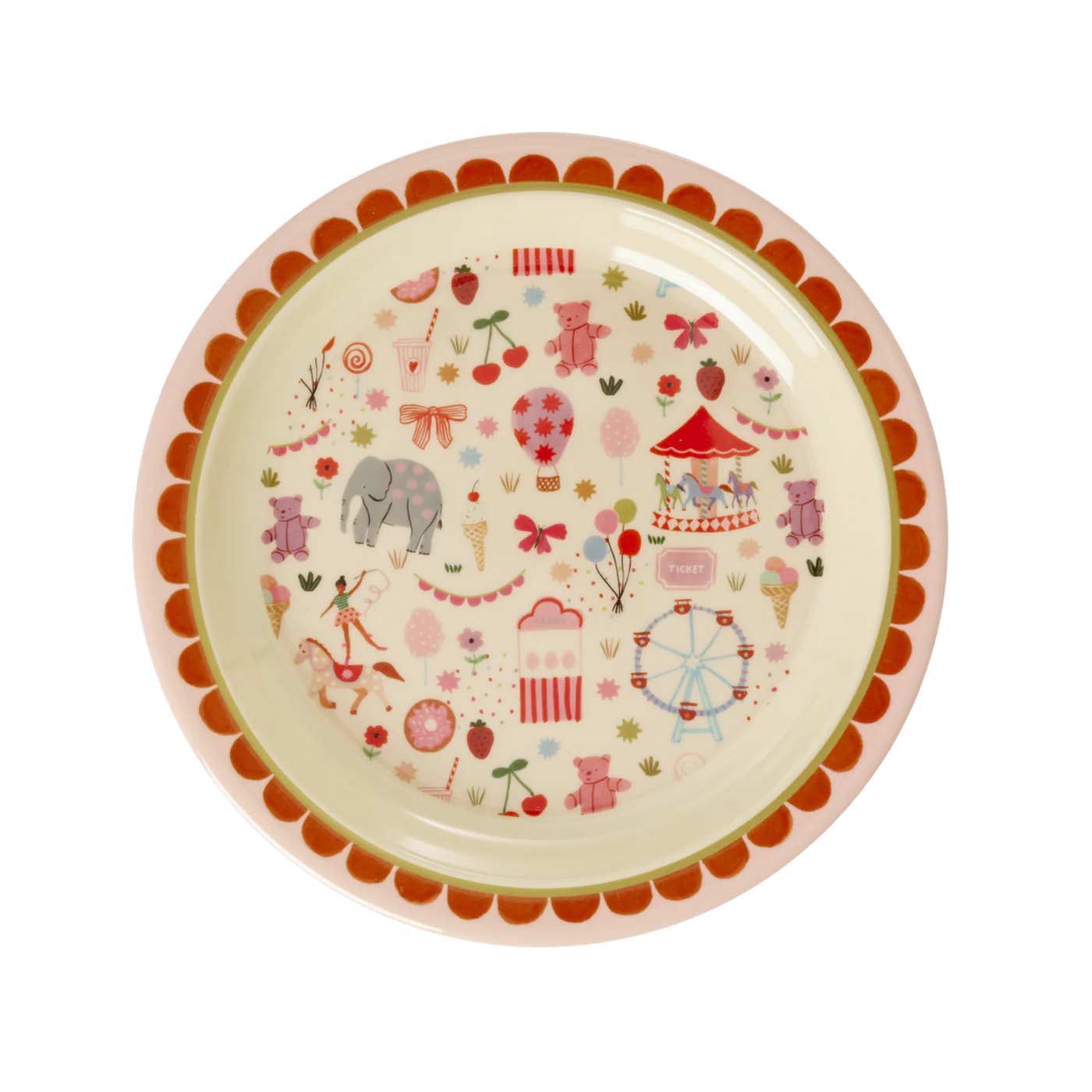 Rice: Rond melamine kinderbord – Fun Fair Print Roze
